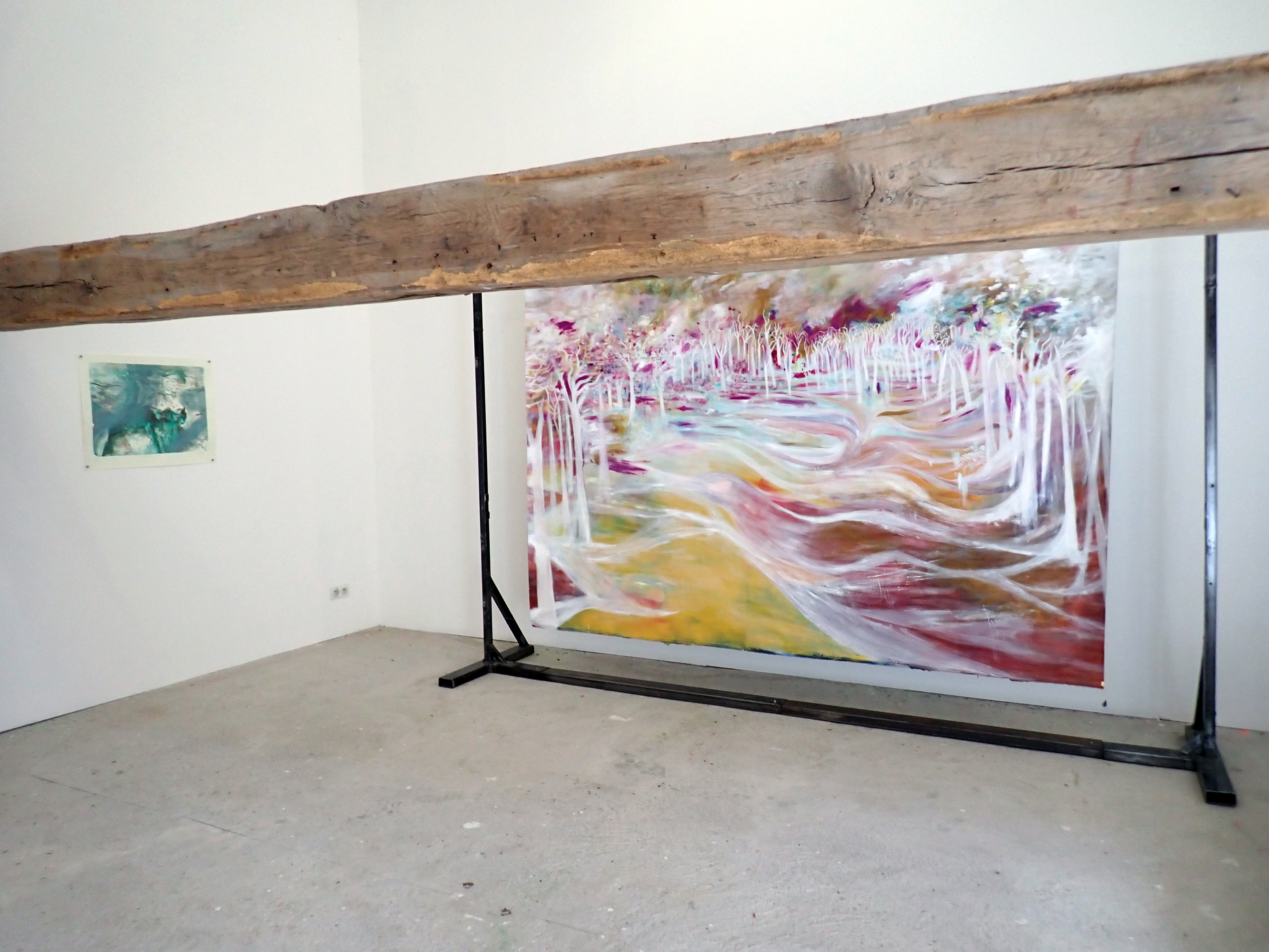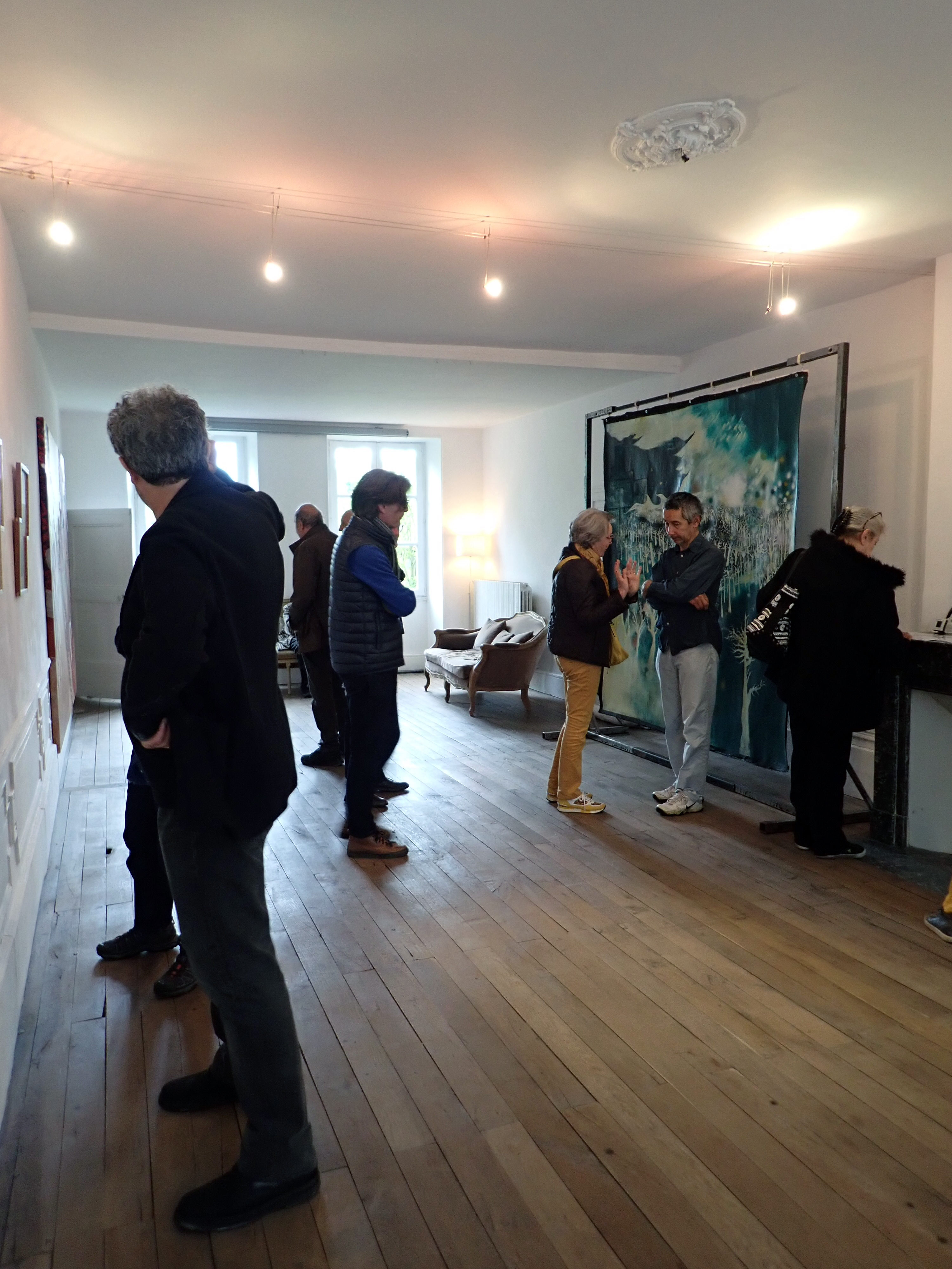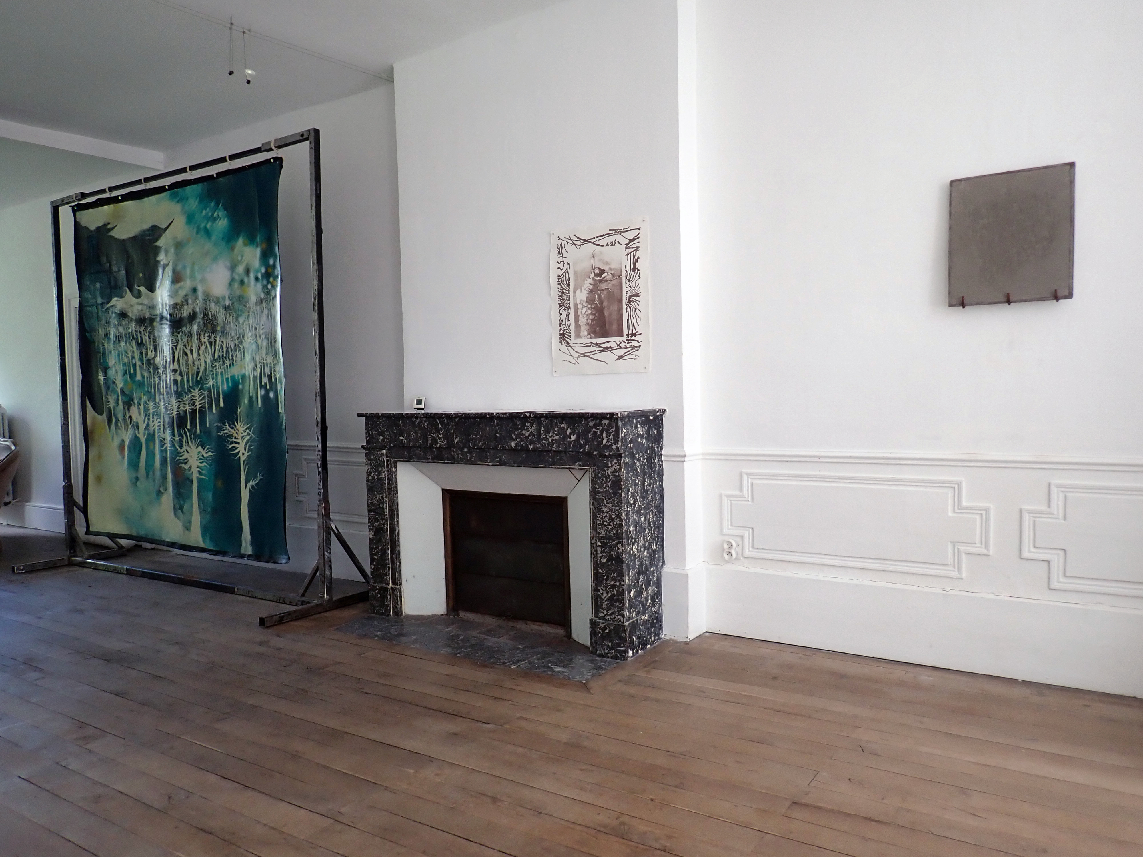 À la Grange-atelier , cinq œuvres sont présentées. Sur le mur du fond, deux estampes de Maxime Delalande [15. Sous Marais habité, lithographie, et 16. Sous Marais, la poésie des vers, lithographie et sérigraphie] explorant les potentialités rêveuses des marais comme autant d'espaces du repos et du recueillement. En vis-à-vis deux grandes peintures, de Maxime Delalande [à gauche, 14. Paysage Bourbonnais, ruines de bruyère,2024) et de Bastien Courdavault [à droite, 17. Forêt III,2024) où l'on retrouve cette double approche dont nous parlions plus haut. Le monde traversé dans une sorte de promenade à travers signes et traces chez Maxime Delalande, et, chez Bastien Courdavault, le monde ainsi que stupeur ralentie et forêt spectrale projetant de longues ondulations autour d'elle. Comme un nouvel élan inattendu ou un accomplissement par-delà la tempête.