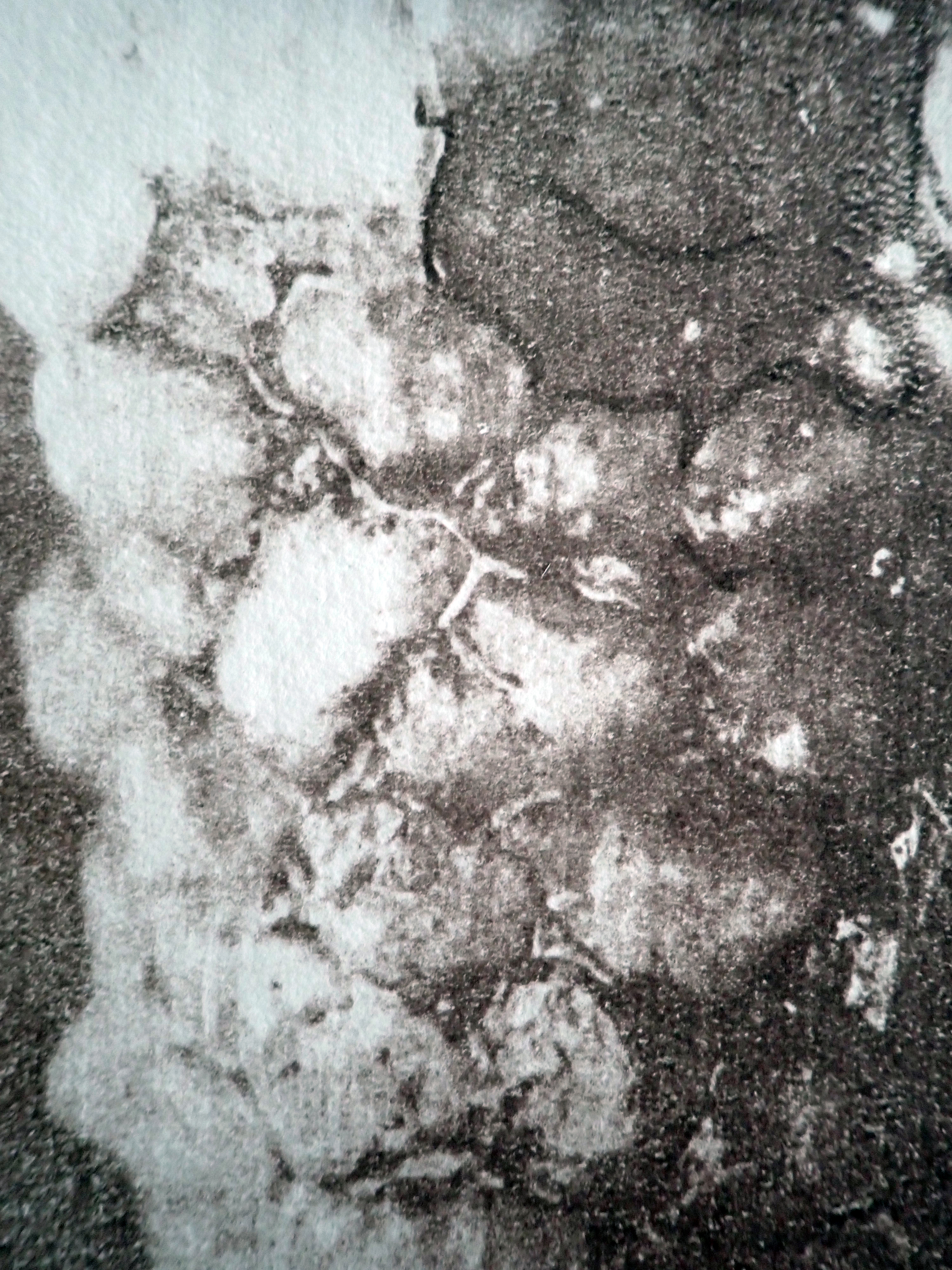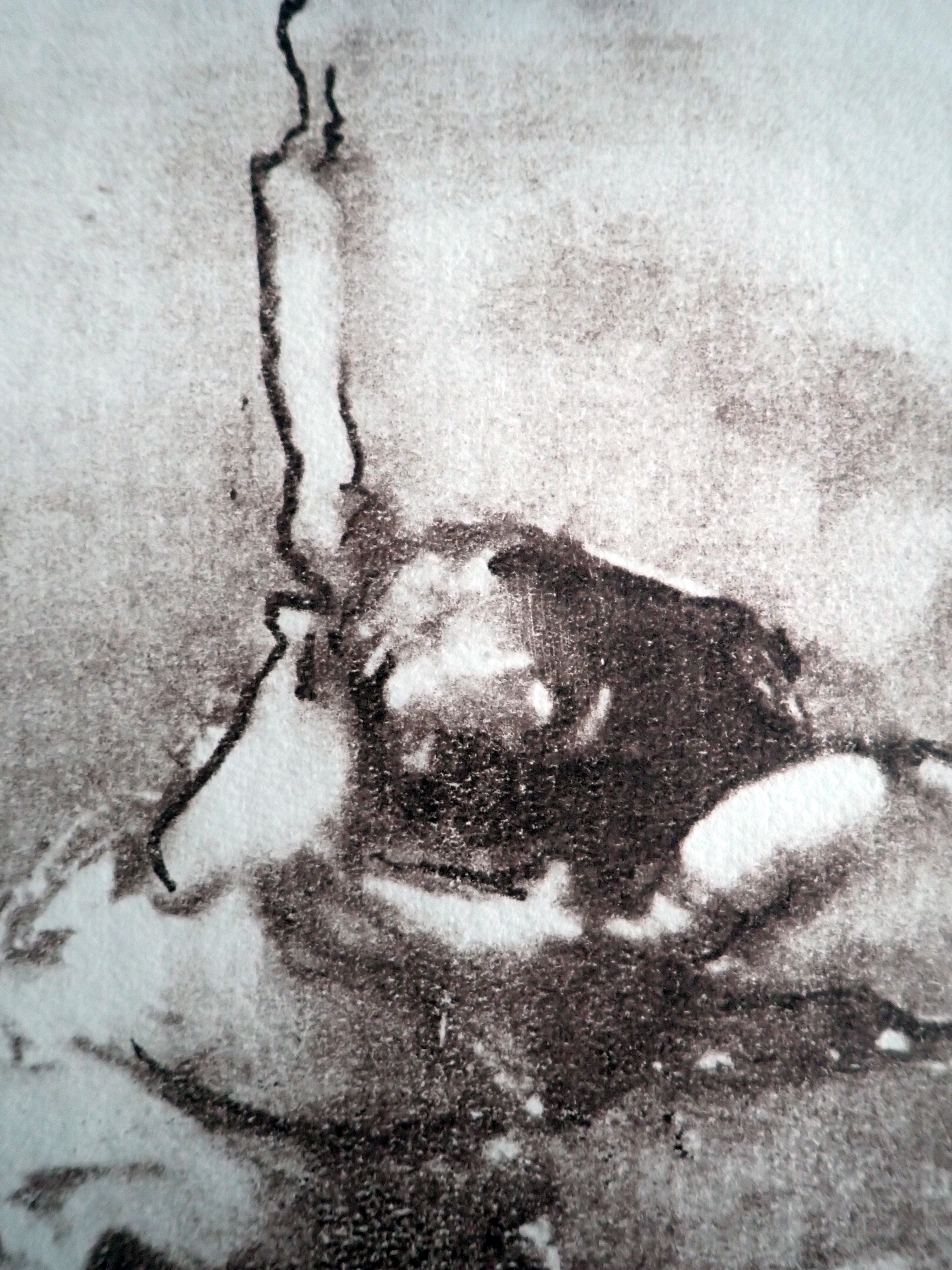 À la Bibliothèque Maxime Delalande présente, sous forme de table de recherche [9. Emprunts aux paysages Bourbonnais], un fragment de son atelier de résidence au DomaineM. Pierres, sables, minéraux, végétaux: voici les agrégats qui, broyés, amalgamés à des liants ou employés comme adjuvants des pigments, vont contribuer aux peintures comme aux encres de lithographies. Deux belles pièces de l'artiste accompagnent cette table [10. L'épreuve du sable de Schoppach, lithographie] et [11. Sous Marais, la poésie des vers, lithographie et sérigraphie] avec toujours ce regard traversant et cette volonté d'installer ou d'attirer le spectateurdans l'image, à titre d'être vivant parmi les êtres vivants, au fond de l'étang ou du marais, parmi ce qui vit de mille manières. La langue de Maxime Delalande est bien celle des traversées joyeuses et des cohabitations enchantées. Une seule pièce, mais quelle pièce ! pour le Cabinet d'arts graphiques. Il s'agit d'une installation d'Ève champion nommée Le sourire dans la vallée [12. Cornes de vaches, cornes en céramique, terre, 2022], installation déjà présentée en quelques lieux avec un vif succès. Sans bavardage, sans démonstration, sans discours : l'installation d'Eve Champion nous touche au cœur. La question animale s'y présente comme un signe muet où viennent se condenser sans doute des interrogations archaïques, entre vertige des charniers et trouble devant la mort renouvelée et sa réinscription déplacée et comme surmontée par l'art.