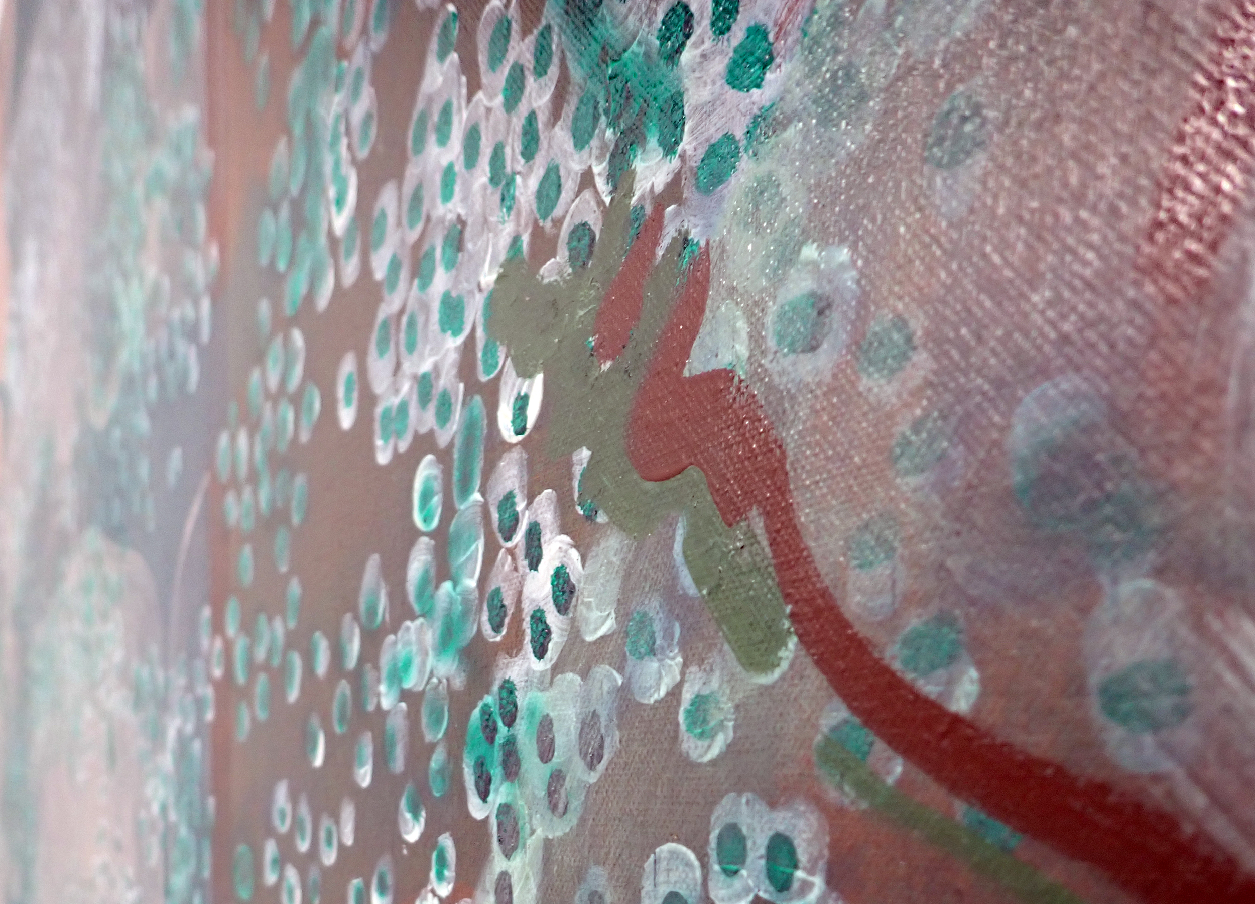 Cette toile est aussi traversée par une tension formelle : entre la fluidité des couches picturales et l’émergence de figures incertaines, racines, corps, nuées, elle rend compte de ce que l’on ne peut tout à fait saisir ni classer. Elle s’inscrit dans une esthétique du vivant en tant que tel : mouvant, interconnecté, parfois douloureux. Peindre ici, c’est porter soin à des territoires blessés, faire œuvre d’écologie sensible. C’est refuser la séparation entre nature et culture, entre corps et milieux habit és. C’est aussi répondre à une nécessité : celle de rendre visible, à hauteur d’yeux, ce qui menace de sombrer dans l’oubli.